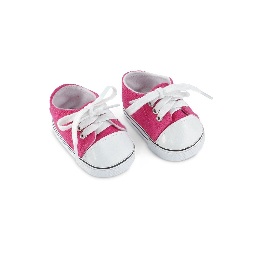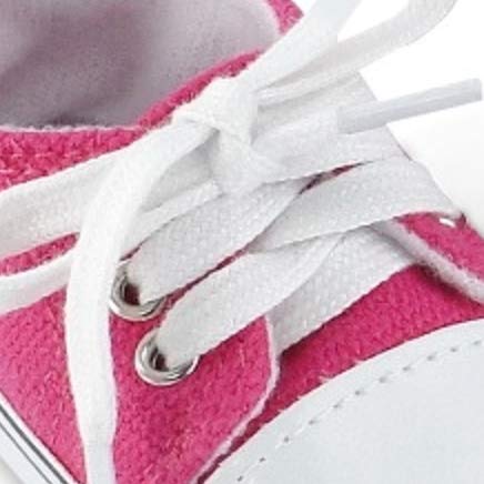 - FEATURE DESCRIPTION: Ultra-cool doll shoes in bright pink, white and black, include faux leather toe, grommets and shoe laces.